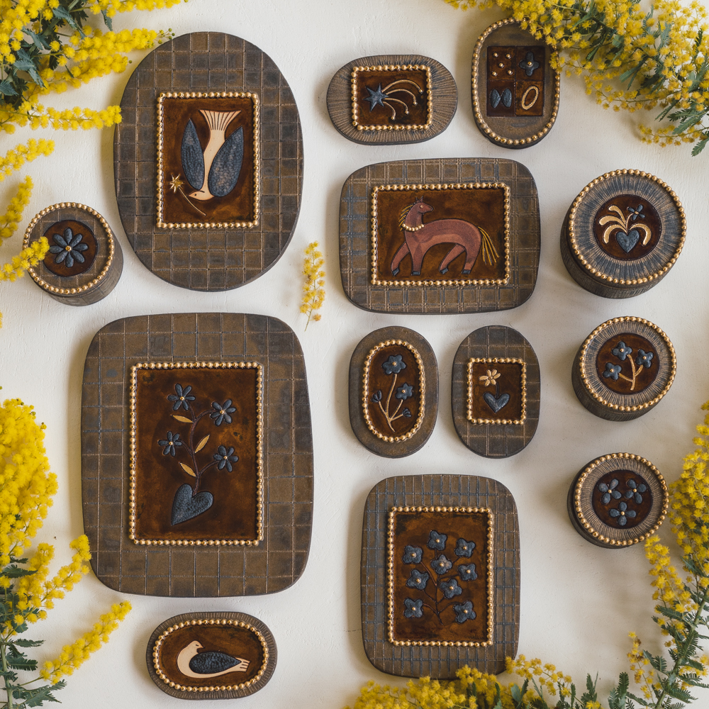 2回目の登場!長屋亜美さんから素敵な作品たちが届きました!うっとりする陶板やアクセサリーや宝物を入れるのにぴったりの蓋物。おうちに飾るとしたらどこに飾ろうかな〜といつも考えるのですが、蓋物は私のデスクの横の棚にリングやピアスを入れて置いておこうかな〜。陶板は迷うな〜。自分の部屋に置きたいけれど玄関や寝室近くにあるちょっとしたスペースがあるのですがそこも捨てがたい・・・。妄想が膨らむばかりー!