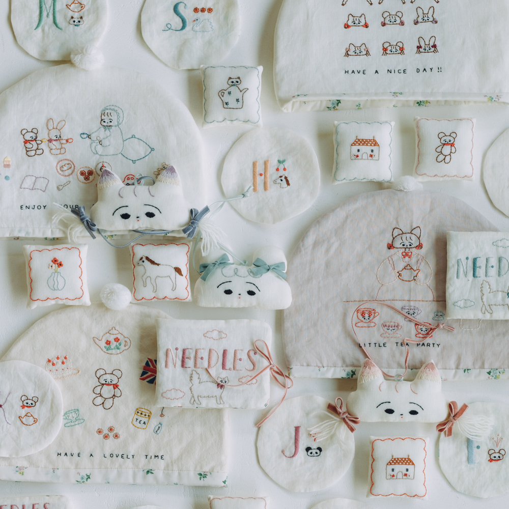 リネンやコットンを使用したナチュラルで手触りが良い布たちにキュートな刺繍やリボンでおめかしをしたとっても可愛らしい作品を作られています。