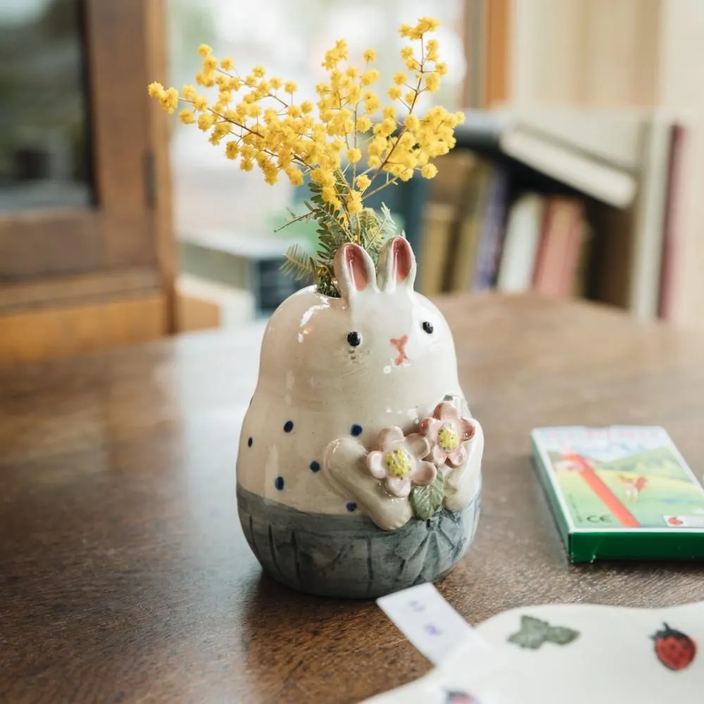 初めましての小松美智子さん。つるんとした質感の器たちは、個人的にも気を遣いすぎずガシガシ使うことが多いのですが、そんなつるんとした器に、美味しそうなイチゴや、可愛らしいウサギがぽこっとついている作品たちをお送りいただきました。