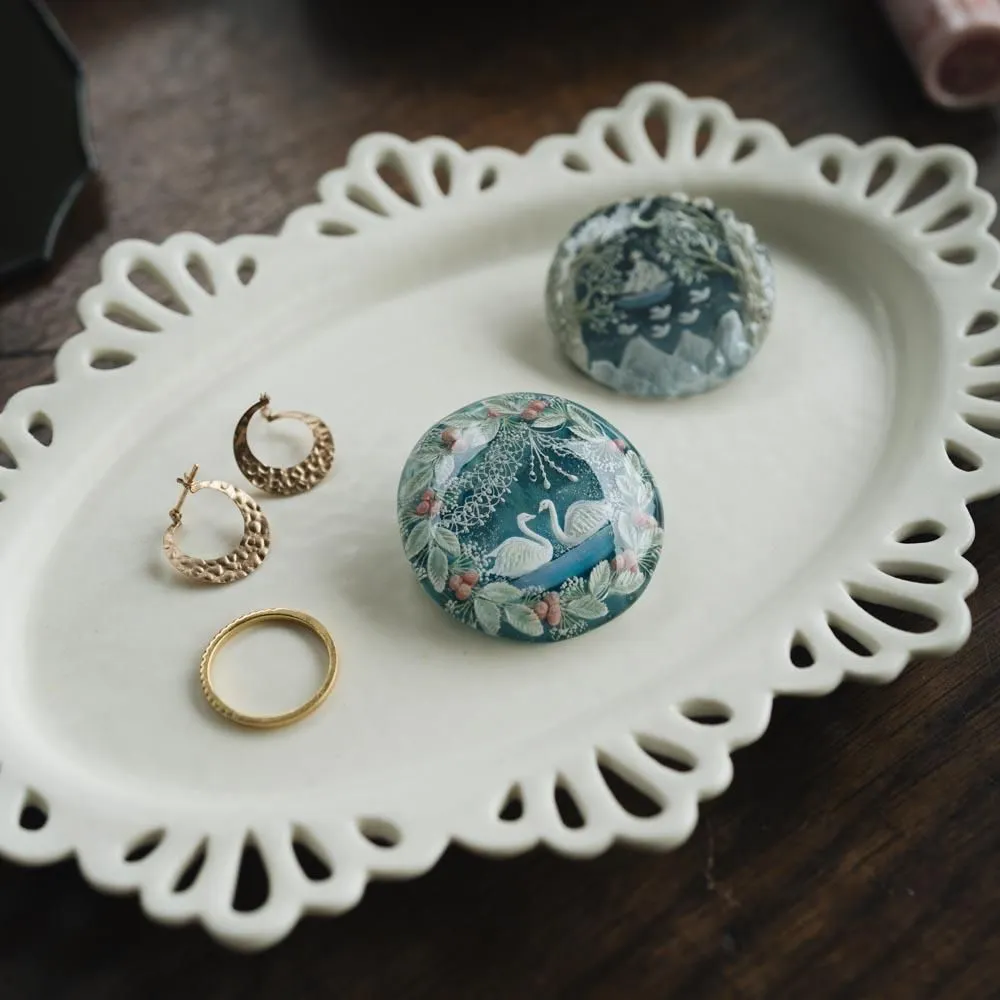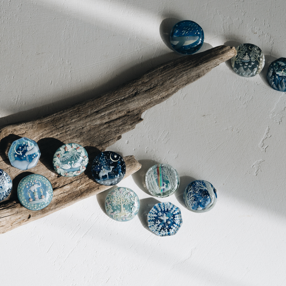 しっとりと上品な青の中で水の中なのかな?これは青空なのかな?こちらは湖なのかな?と色々な世界を表現されています。春を感じる華やかなもの、吐く息が白くなりそうな澄んだ空気感のもの、どうぶつたちが小躍りしそうな楽しさを感じさせるものなど、このブローチの中に本当にさまざまな物語がギュギュギュッと詰まっていてうっとり。樹脂の素材なのでとっても軽く、洋服やバッグ、帽子などに付けられます。眺めているだけでも美しいなと思うので、飾ってインテリアとしても◎ぜひこの機会にご覧いただけたら嬉しいです。