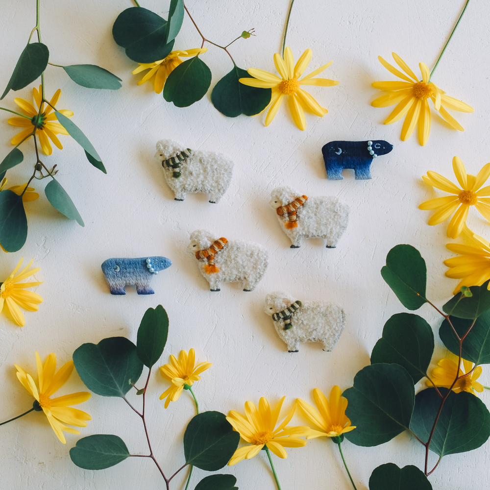 前回もでしたが今回もその丁寧で美しく繊細な作品たちに癒しと同時になんだか身が引き締まる気がします。もふもふした羊さんはセーターやベレー帽なんかにも合いそうだなぁ。壁に飾ったりできないのかな〜なんて思いながら花やユーカリを額に見立てた写真を撮ってみたのが上の写真です。少しずつ集めてこんなふうに飾ってもすごく可愛いんだろうなと一人妄想を膨らませていました。