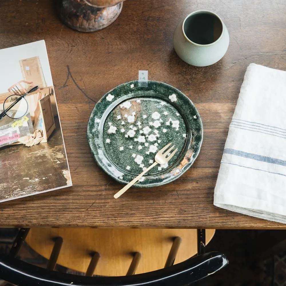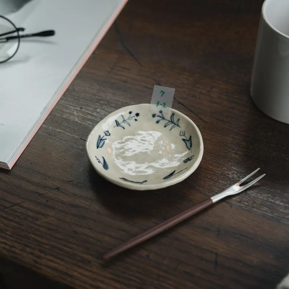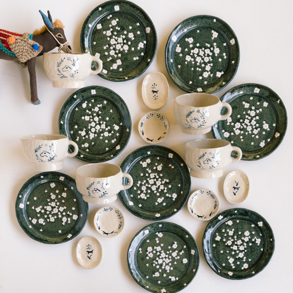 深みのある大人っぽいグリーンのなかに咲く花は本当にお皿の中で咲いているよう。咲き方が微妙に異なるのですが、どれも可愛くて選べないなと眺め、今回個人的にもすごく楽しみにしていたマグ。スープもたっぷりそ入りそうな大きさで、ゆらぎのある形が個人的につぼなのですが、そこに青で描かれる馬や草花の線がまたかわいい!物語を感じます。そして何気に一番食卓での登場回数の多い豆皿も。醤油や塩を入れて食卓で使っても、どのアイテムにも言えることですがインテリアとしてアクセサリートレイにしても◎上品で軽やかな作品たちをぜひご覧いただけたら嬉しいです。